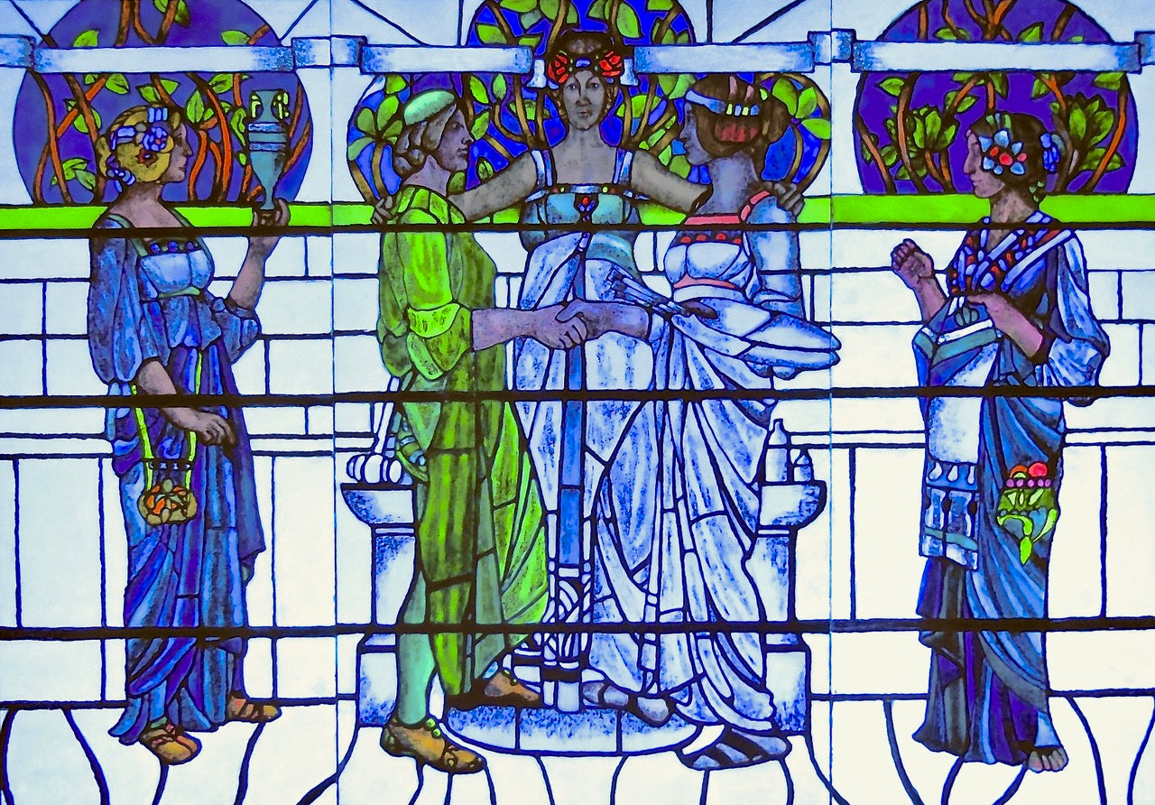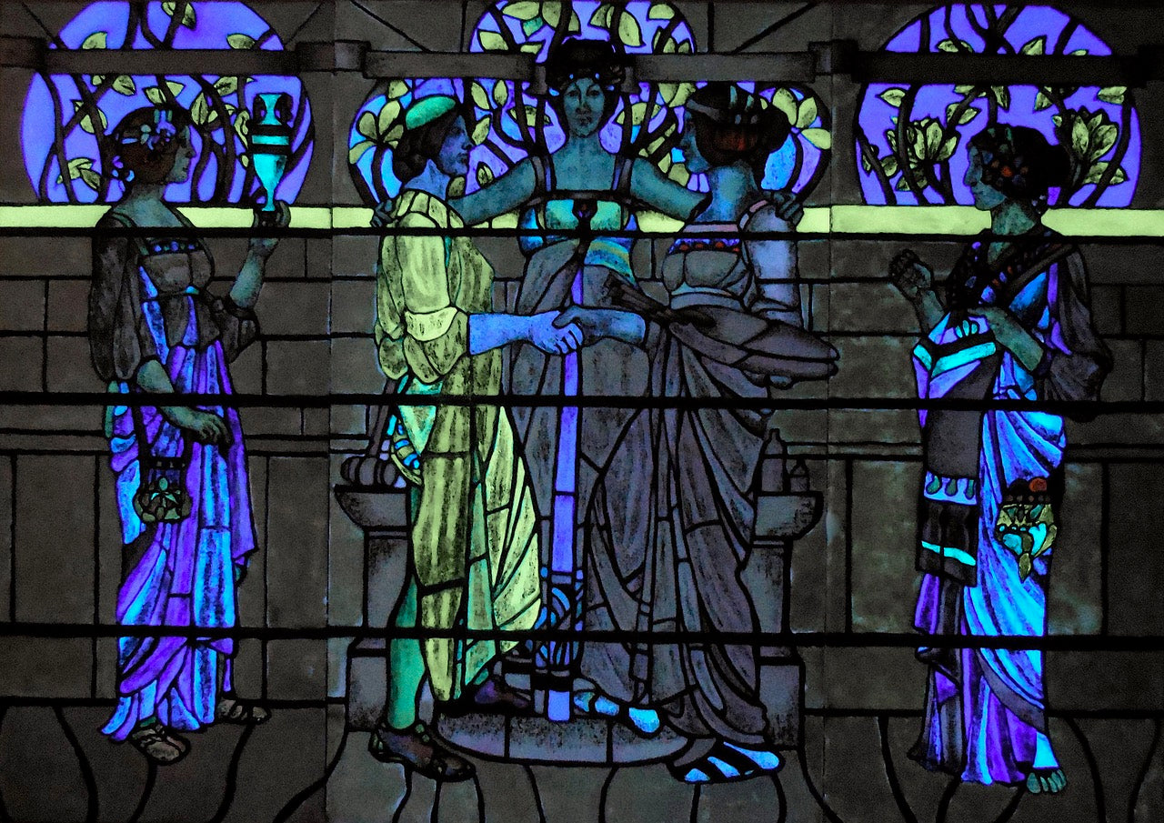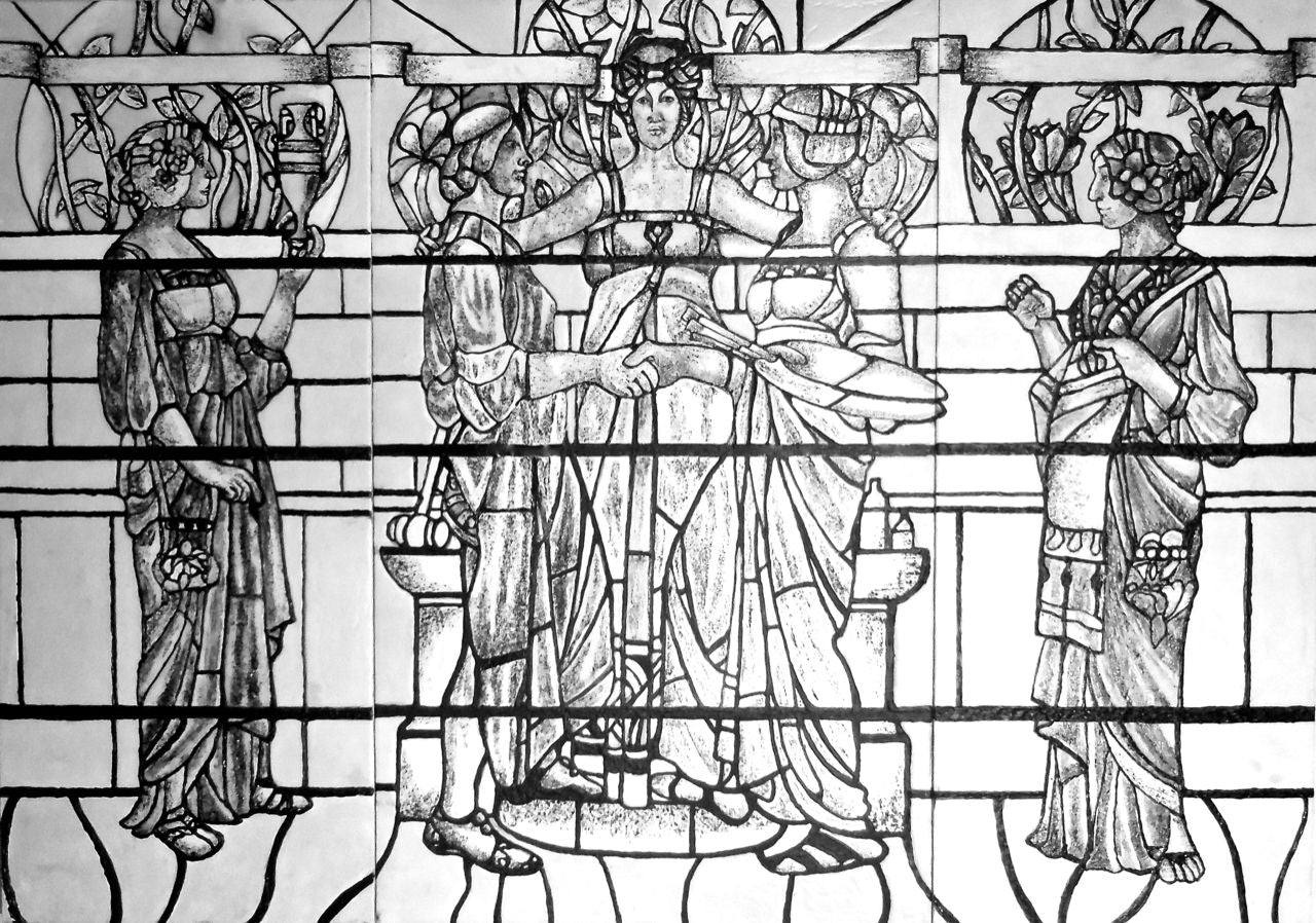 "Arts & Crafts" re-imagines a 1904 stained glass window by J. Edgar Mitchell through a luminous blend of phosphorescent, fluorescent, and acrylic polymers on wood panels. Presented as a 40" x 57" triptych, the piece glows with vibrant energy, celebrating the beauty of craftsmanship and light. This contemporary interpretation breathes new life into historic design, offering a dynamic visual experience that shifts with changing light.