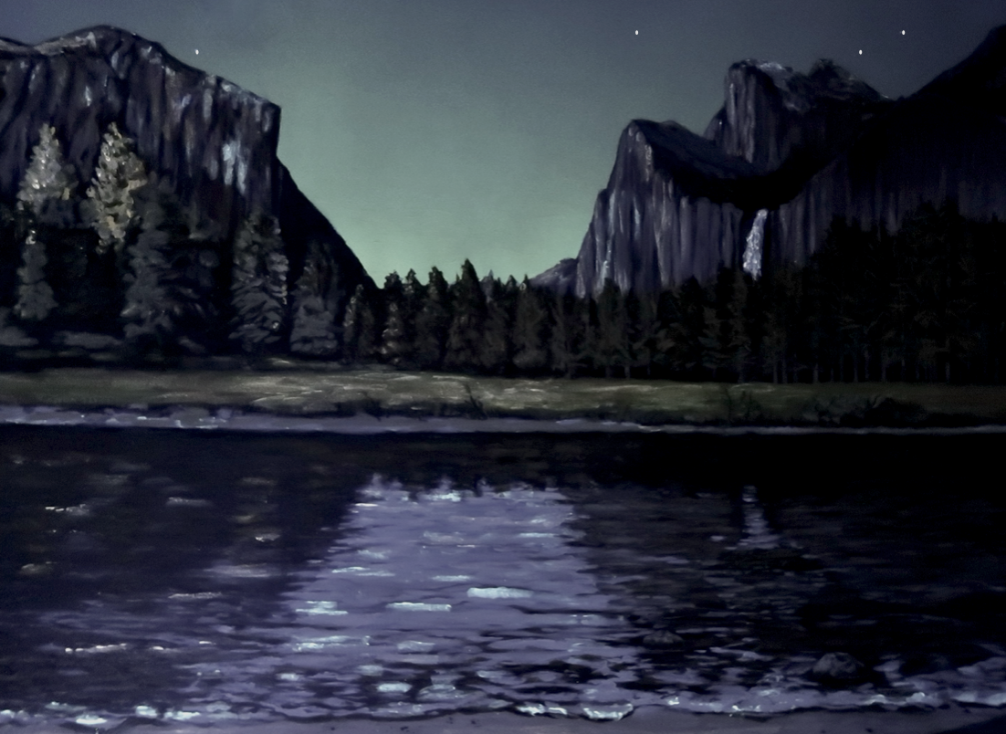 "Merced River Yosemite" captures the serene beauty of nature using a vibrant blend of acrylic and phosphorescent paints on a 30" x 40" canvas. The painting glows subtly in low light, evoking the timeless magic of Yosemite’s landscapes. The dynamic interplay of color and light invites viewers into a peaceful, ever-changing natural scene.